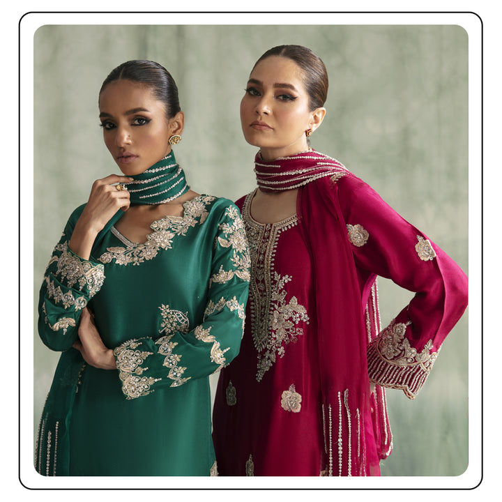 Majestic Maroon is a captivating ruby red long shirt adorned with intricate swaroski and zardozi worked embroidery on the neckline, sleeves and hemline, adding a touch of opulence. The 80 gram pure rawsilk drapes gracefully, accentuating the figure. Paired with a stunning organza shawl, featuring delicate silver swaroski detailing and straight fitted trousers, this ensemble exudes timeless beauty.