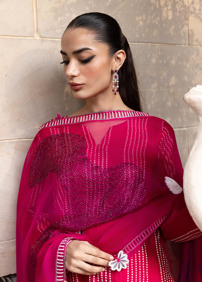 A breathtaking statement in fuchsia silk, this ensemble radiates bold elegance with its flowing silhouette and couture detailing.