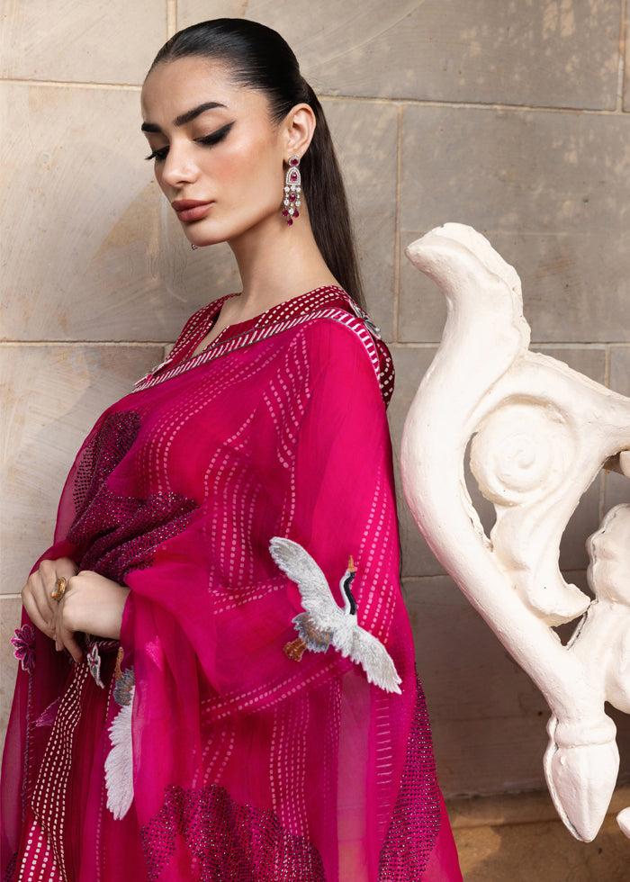 The pure organza dupatta is the centerpiece — adorned with glistening stones, embroidered birds in flight, and finished with intricate borders. At each corner, delicate 3D embroidered flowers bloom, giving the drape an exquisite, high-fashion finish.