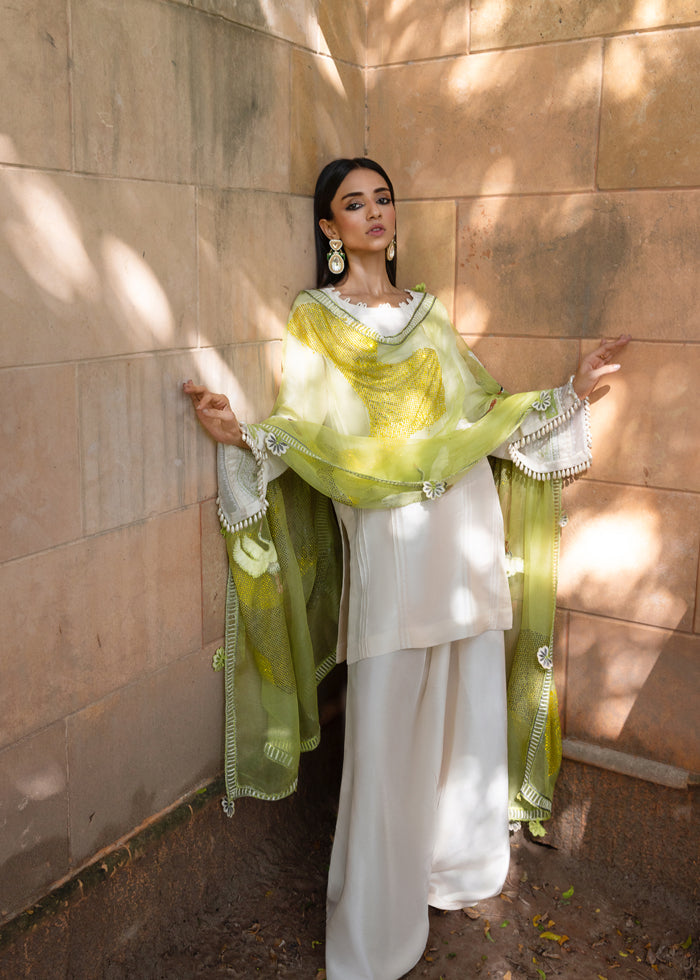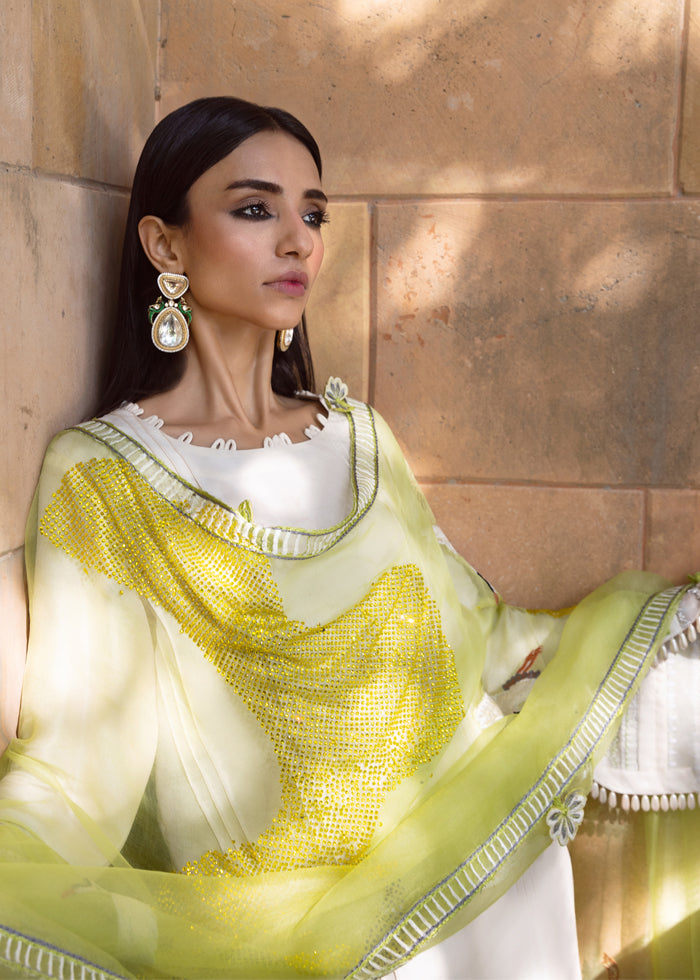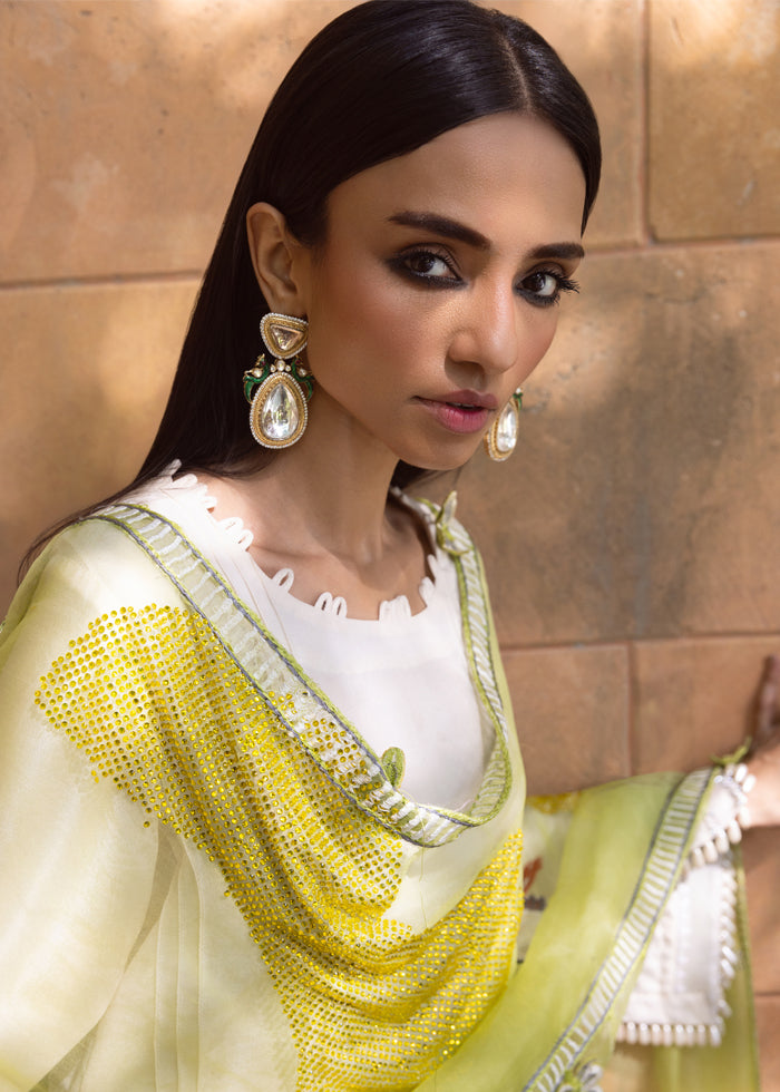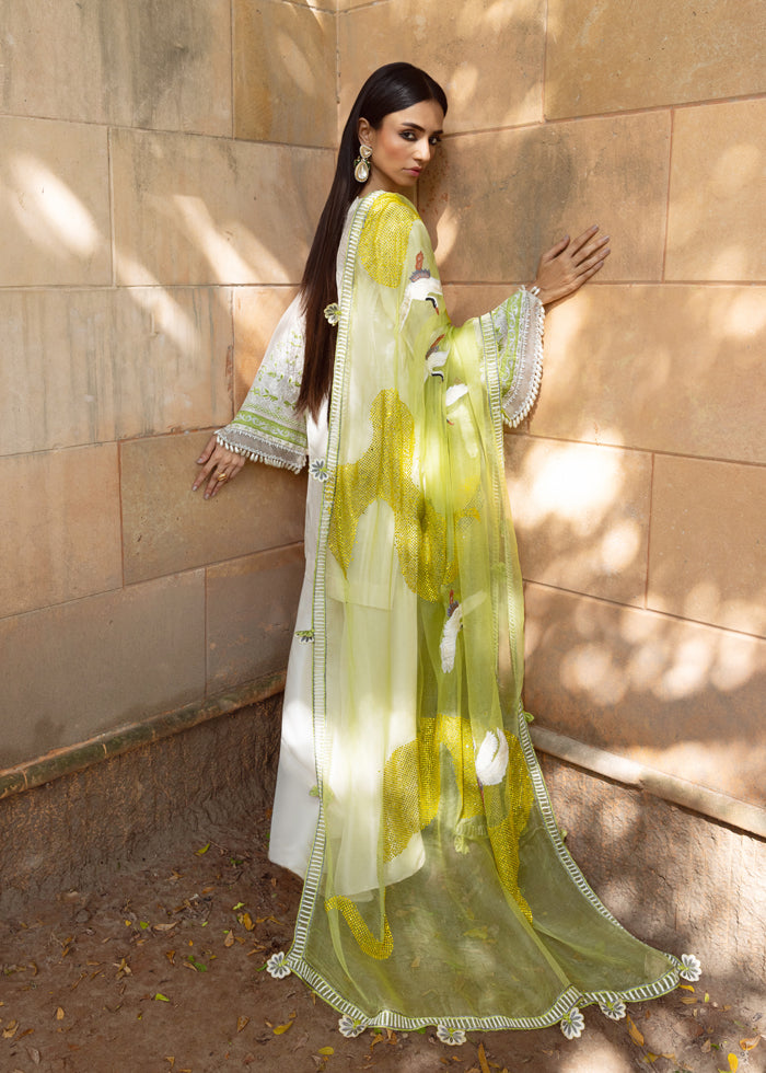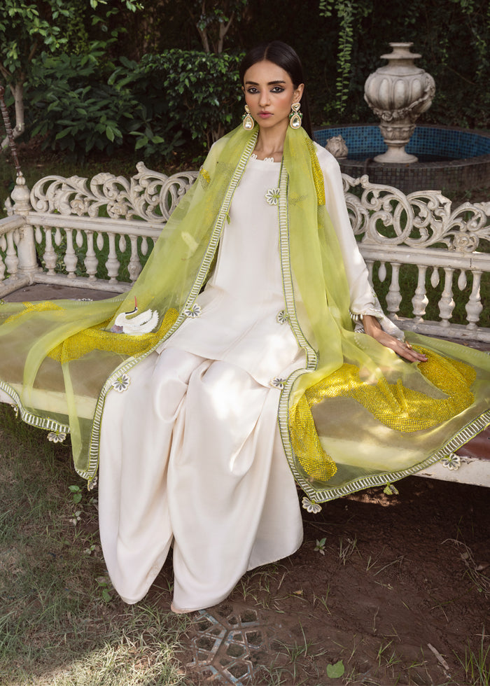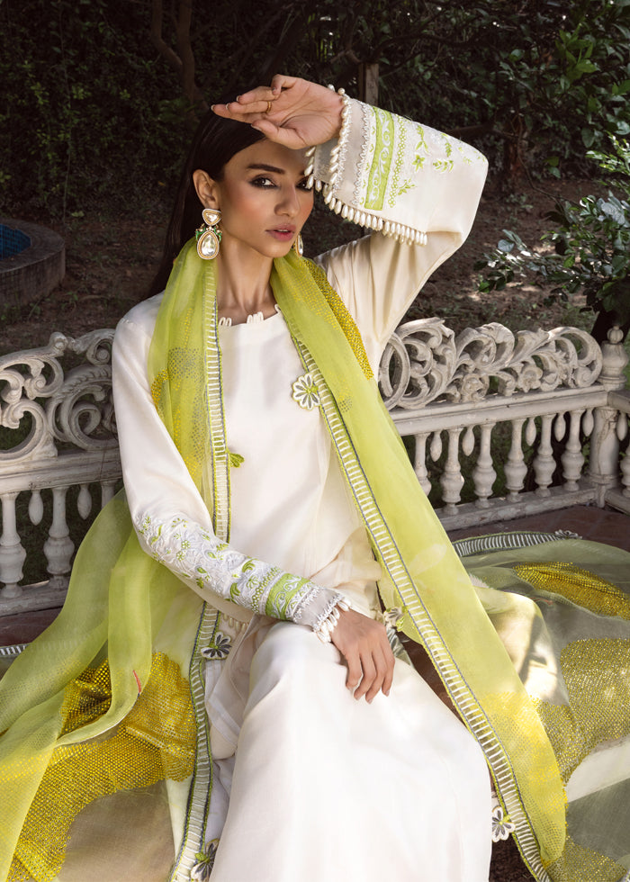 A vision of pure grace, this off white raw silk ensemble is elevated into artistry by its masterpiece dupatta. Crafted in sheer lime-green organza, it shimmers like sunlight—strewn with glistening stones, retium-embroidered birds in flight, and an all around border along with 3D cut-out flowers, each petal sculpted to perfection. The dupatta alone becomes a spectacle, commanding attention with its ethereal aura.
