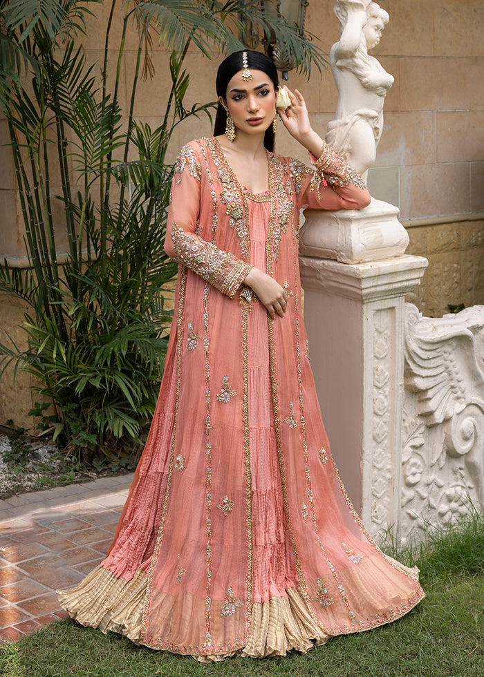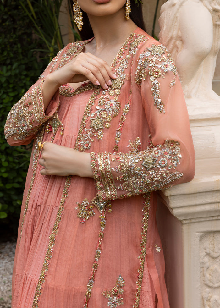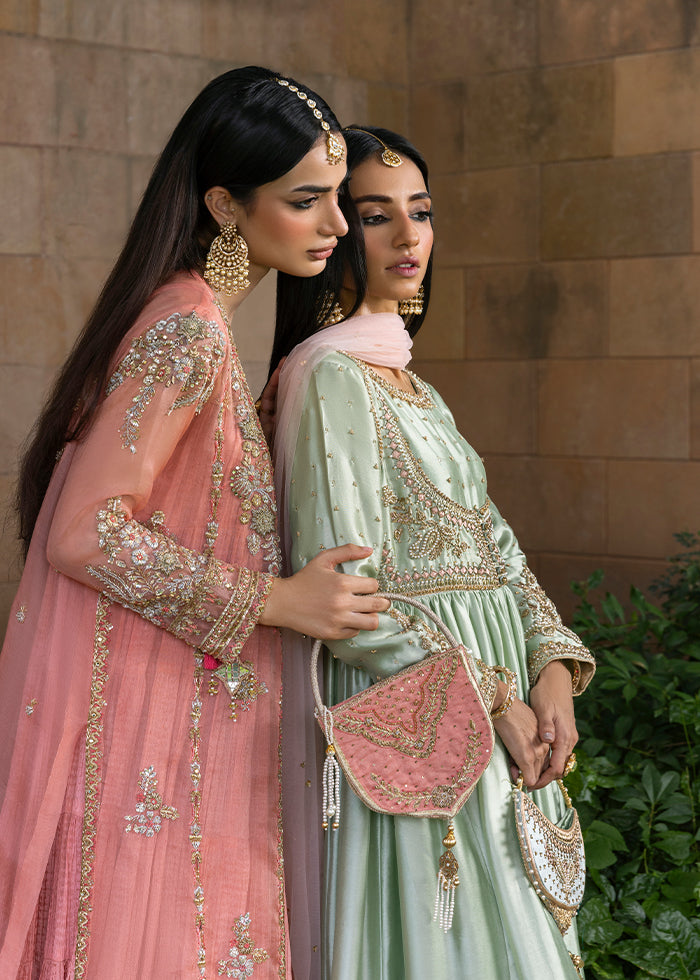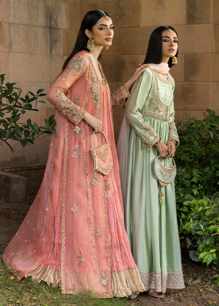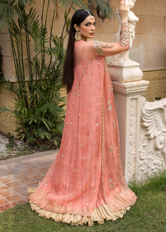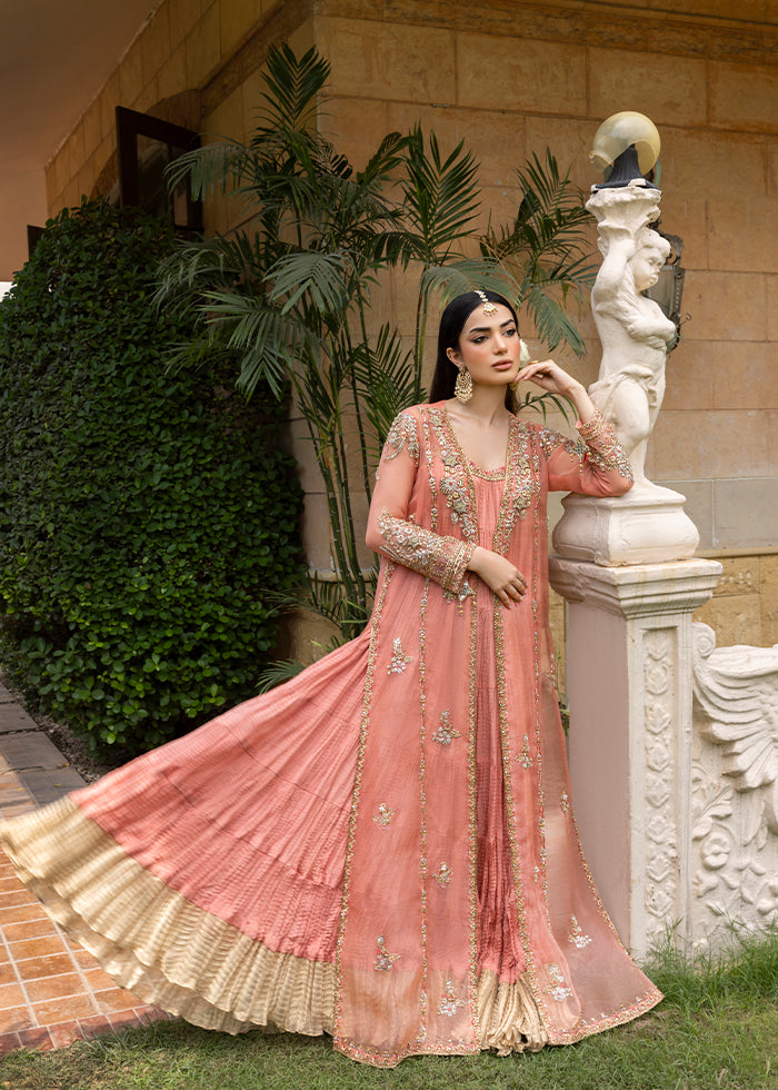 Flowing beneath, a crushed silk and tissue Anarkali adds depth and movement, with its neckline delicately hand-worked, ensuring every layer whispers craftsmanship.