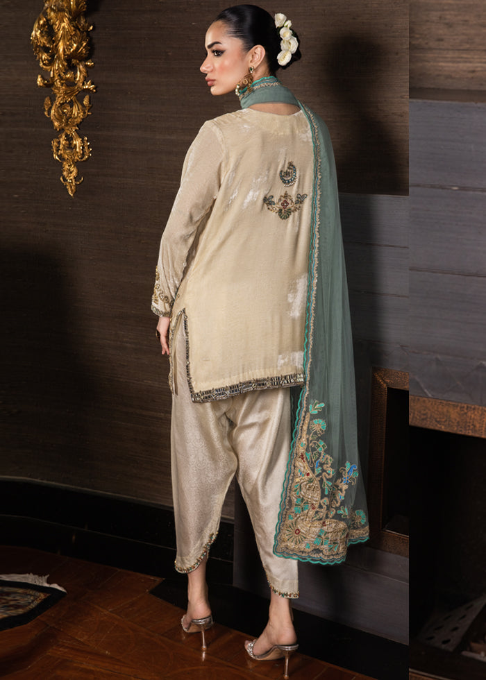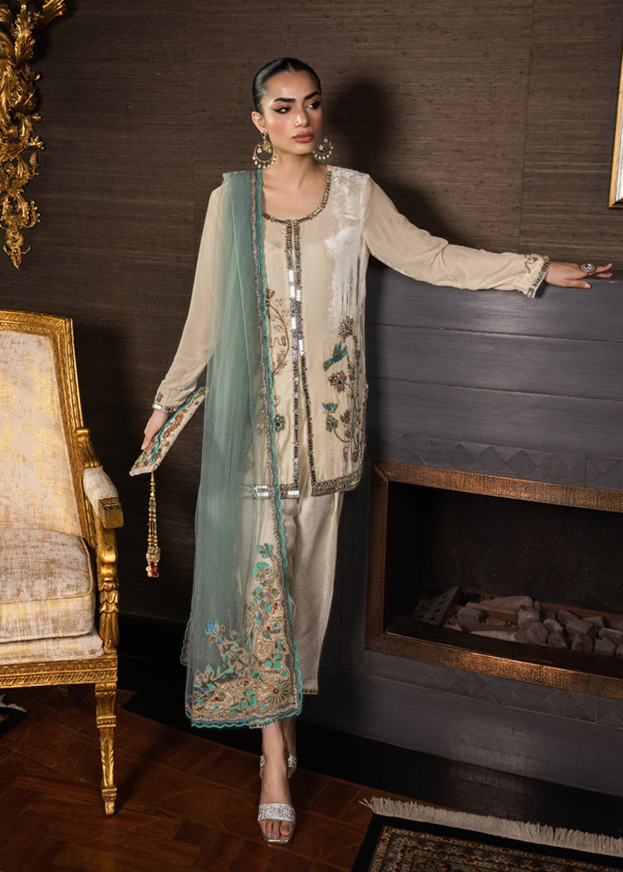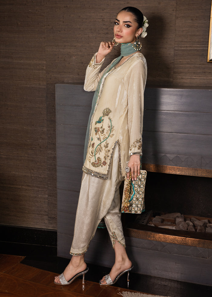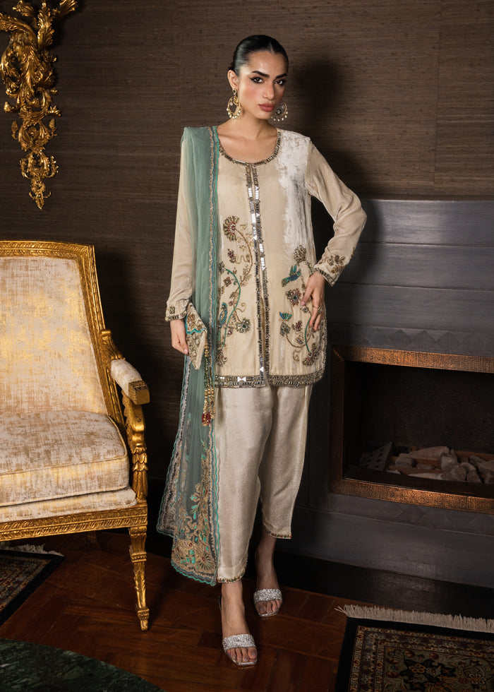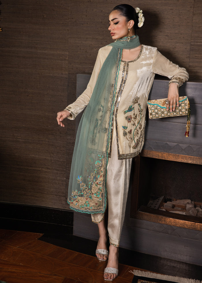 A vision of regal elegance, this ivory ensemble is crafted entirely in pure French Velvet, creating a canvas of timeless luxury. The jacket glows with intricate handwork of zardozi, resham, and luminous polki, each motif delicately worked with an artistry that speaks of heirloom grandeur. The shalwar, equally indulgent in embossed jamawar, is adorned with finest hand work — an opulent detail that sets it apart.