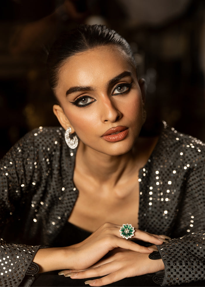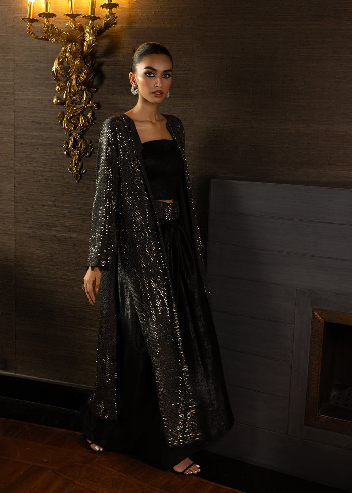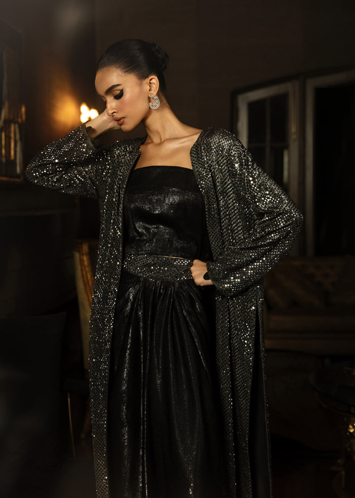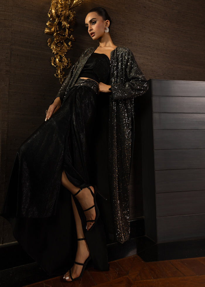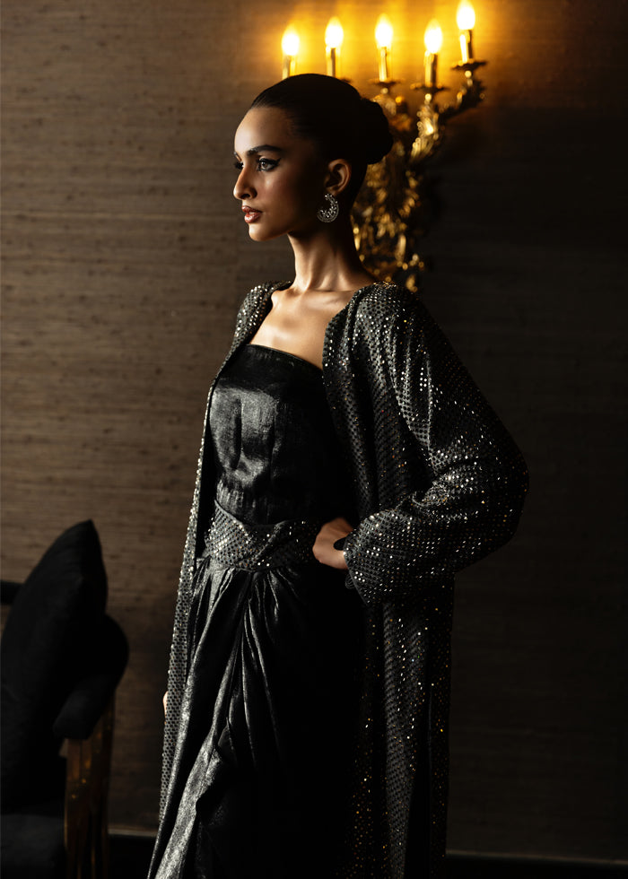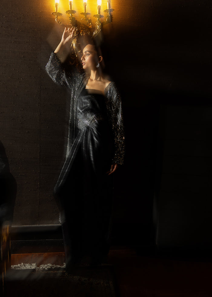 An ode to modern glamour, this charcoal grey long jacket is encrusted throughout with the finest high-quality stones, shimmering with every movement. The front-open silhouette flows effortlessly over an embossed pure silk inner slip, creating a striking contrast of textures. Paired with a beautifully draped, high waisted, self embossed pure silk skirt, cinched with a stone-embellished belt, the ensemble radiates opulence and refined sophistication, making it an unforgettable choice for evening soirées.