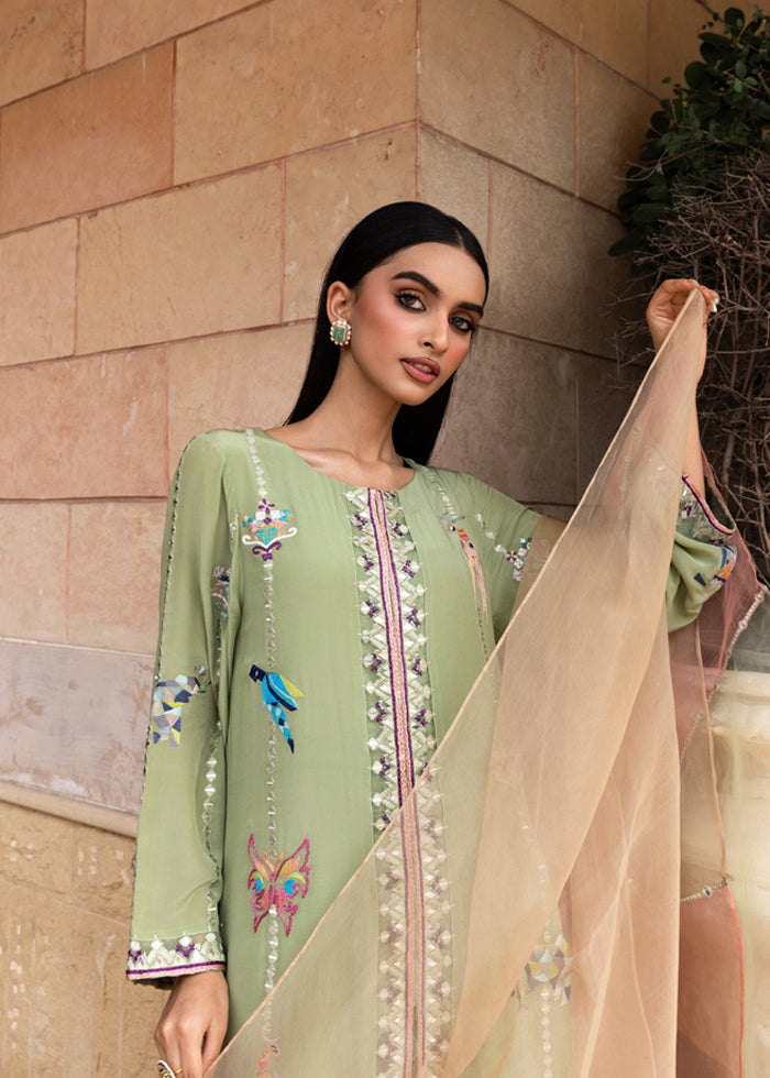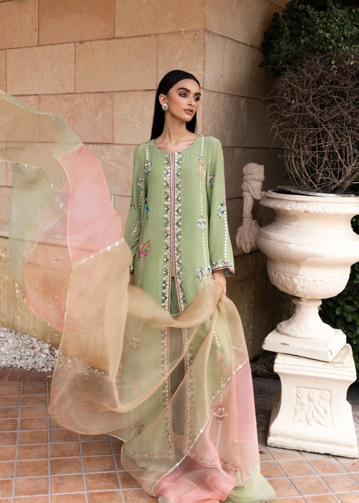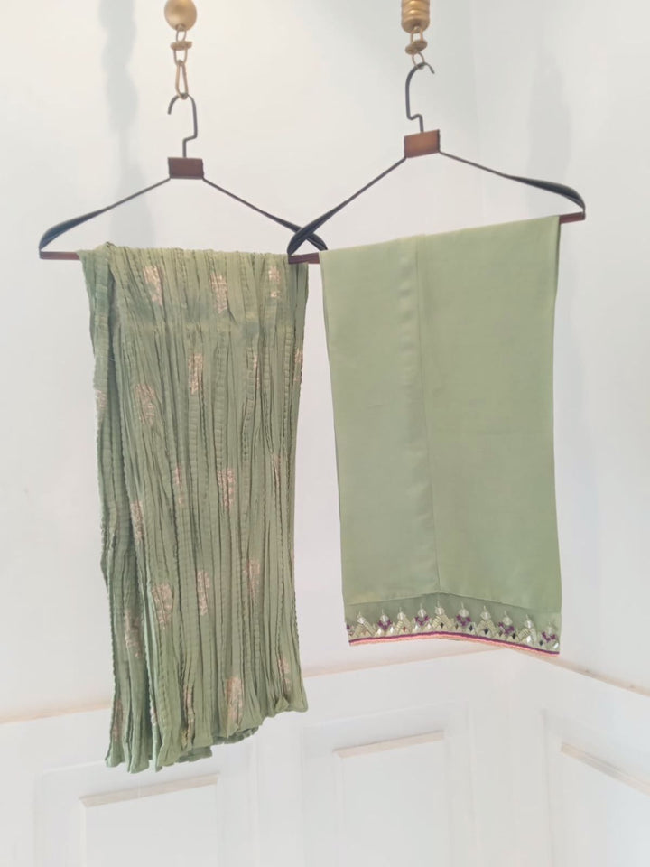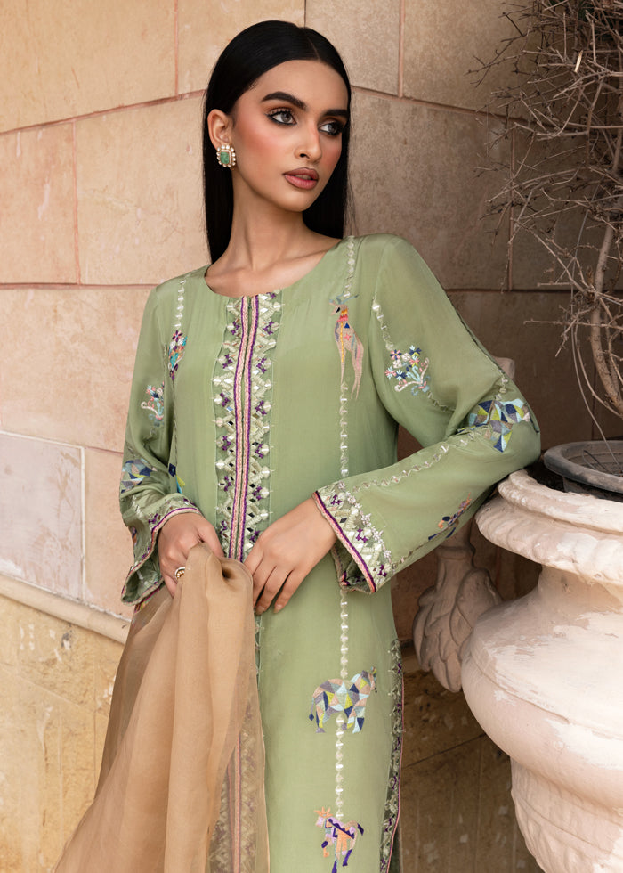 Step into timeless artistry with this exquisite pure-grip ensemble in a refreshing shade of mint green. The shirt is delicately embroidered with resham and mirror work, featuring unique abstract animal motifs that give it a statement edge while retaining its elegance.