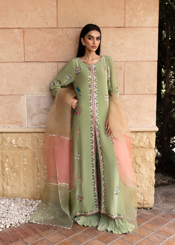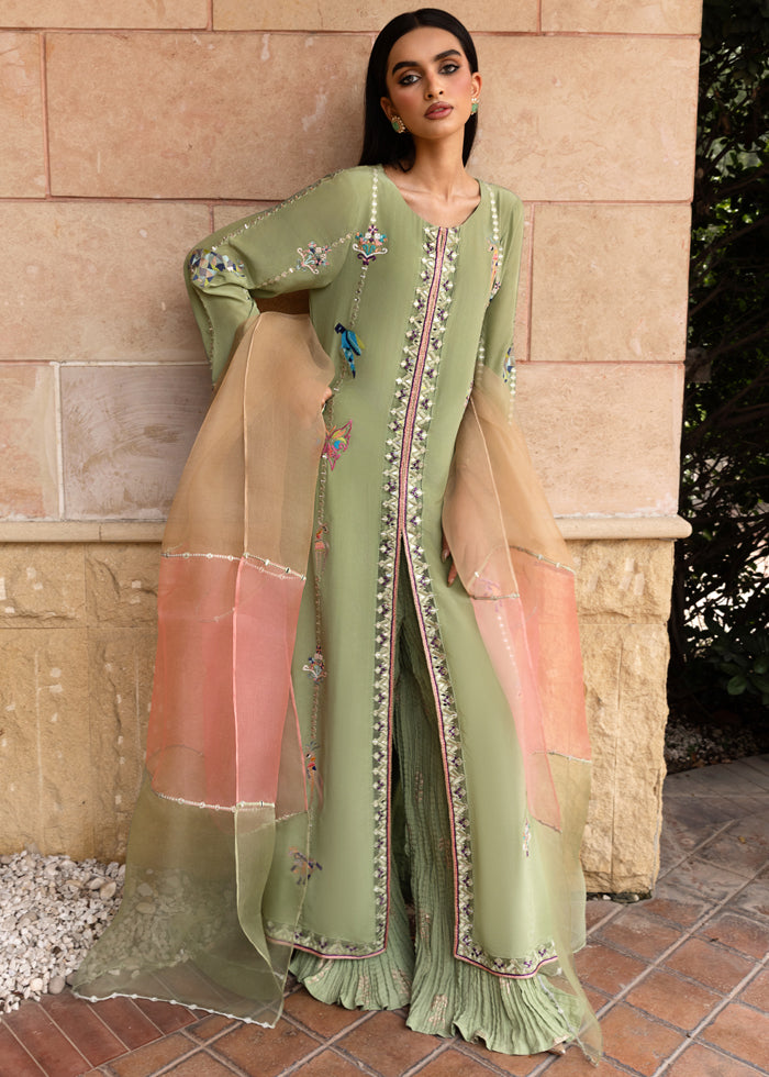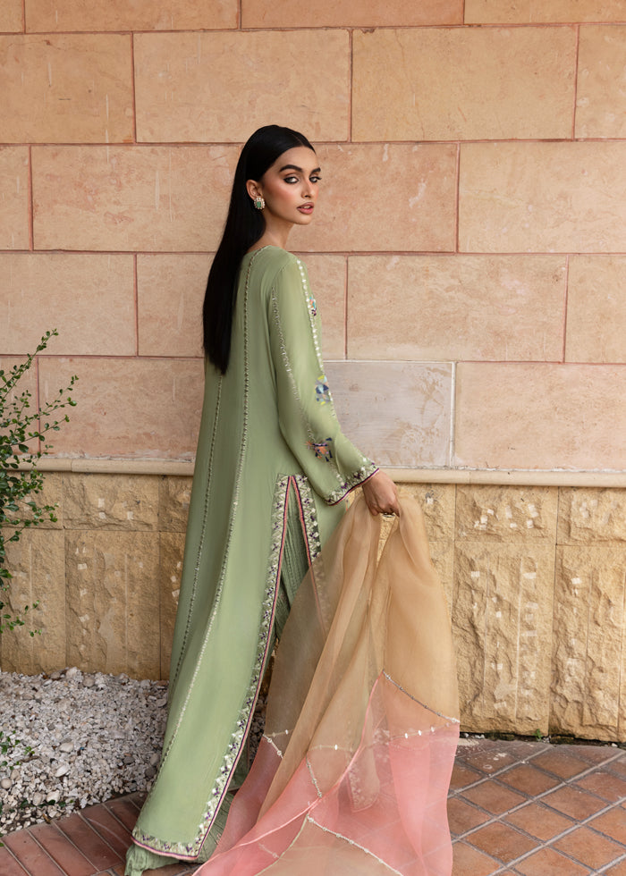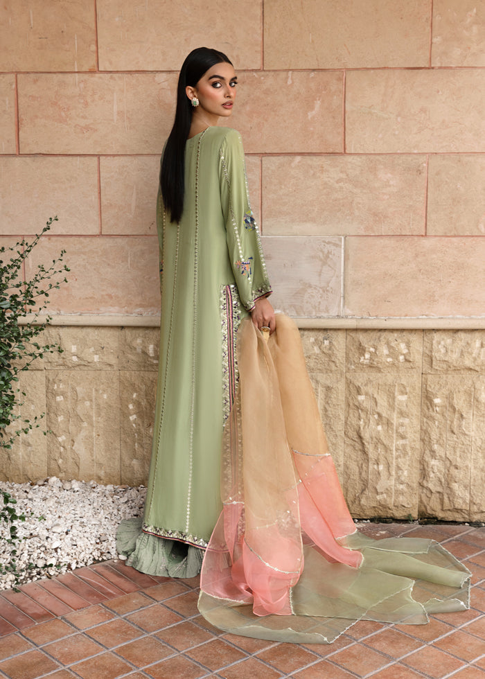 It is paired with a flowing crushed sharara, adorned with subtle golden block printing that adds depth, texture, and a regal shimmer to the look. Completing the outfit is a three-toned pure organza dupatta, a true masterpiece in itself, embellished with intricate mirror work and delicate craftsmanship—creating a luminous finish with every drape.