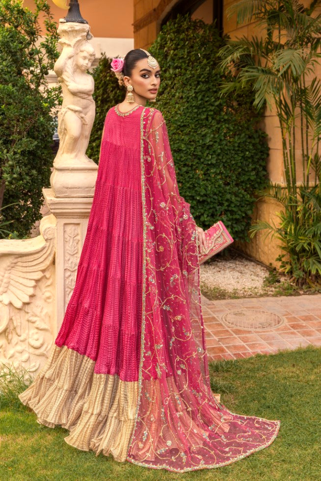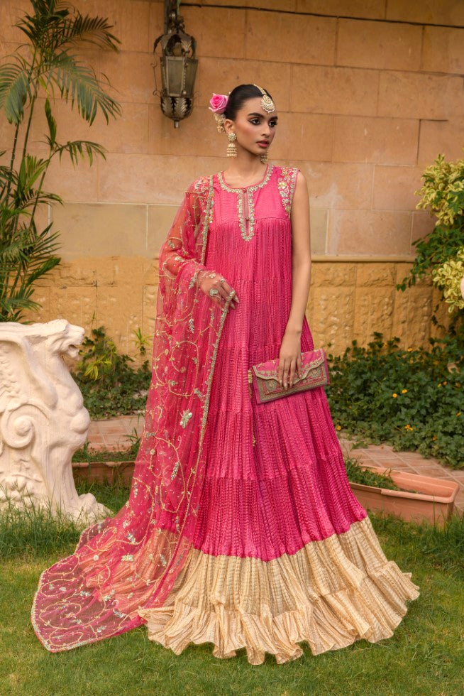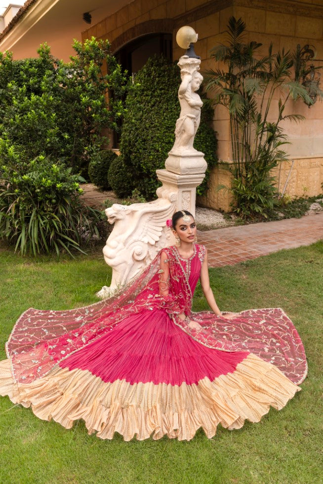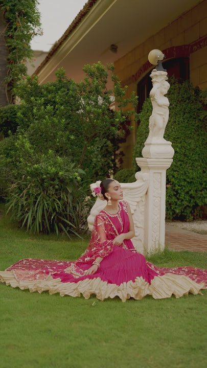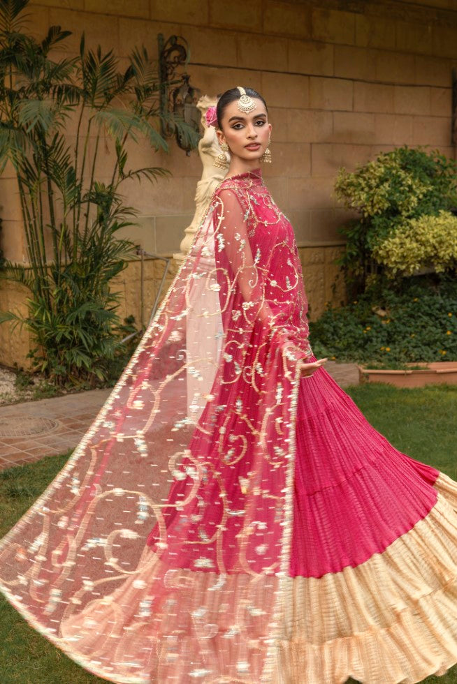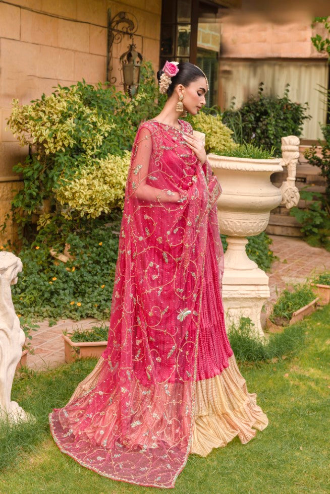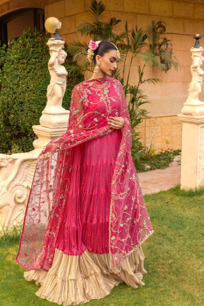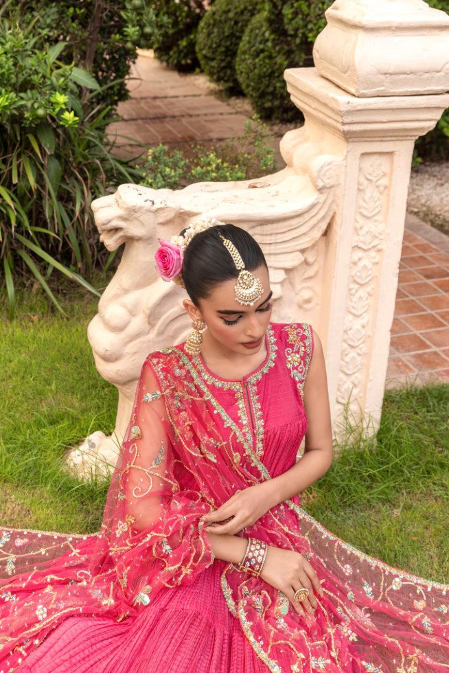 Drenched in the richness of rose pink crush, this regal Kalidar flows with effortless grace. The bodice shimmers with intricate Zardozi and Resham handwork, while its voluminous silhouette cascades into a striking gold hem, evoking timeless grandeur. Paired with a delicately handworked regal dupatta — embellished in Zardozi, Mukesh and Resham — it completes a masterpiece of elegance. Whether styled sleeveless for a contemporary charm or with bespoke sleeves for a more classic appeal, this ensemble is crafted for the woman who desires to wear art, not just fashion.
