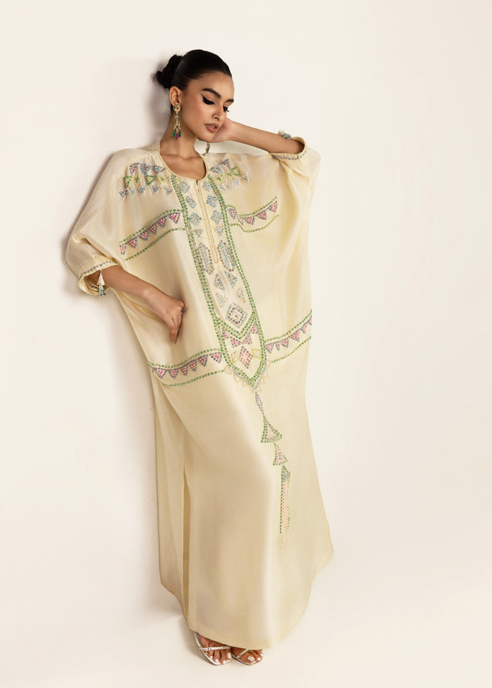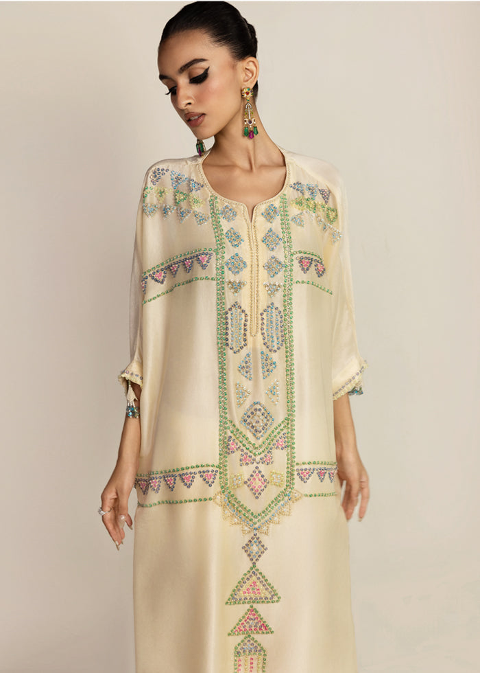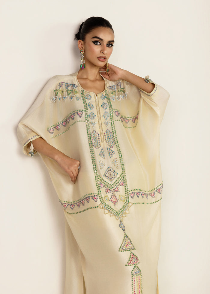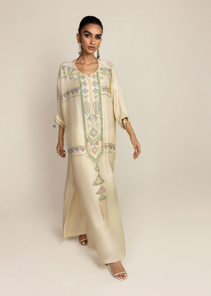 Ethereal and radiant — this flowing kaftan in pure ivory raw silk is delicately hand-worked with Swarovski stones and pastel pearls. The embellishments shimmer in soft hues of blush, mint, and lavender, weaving subtle geometry into a canvas of elegance. Each detail glows with refined brilliance, lending the shirt an aura of quiet opulence, adorned with the most charming sleeve hangings, adding a playful yet refined touch to its flowing elegance.