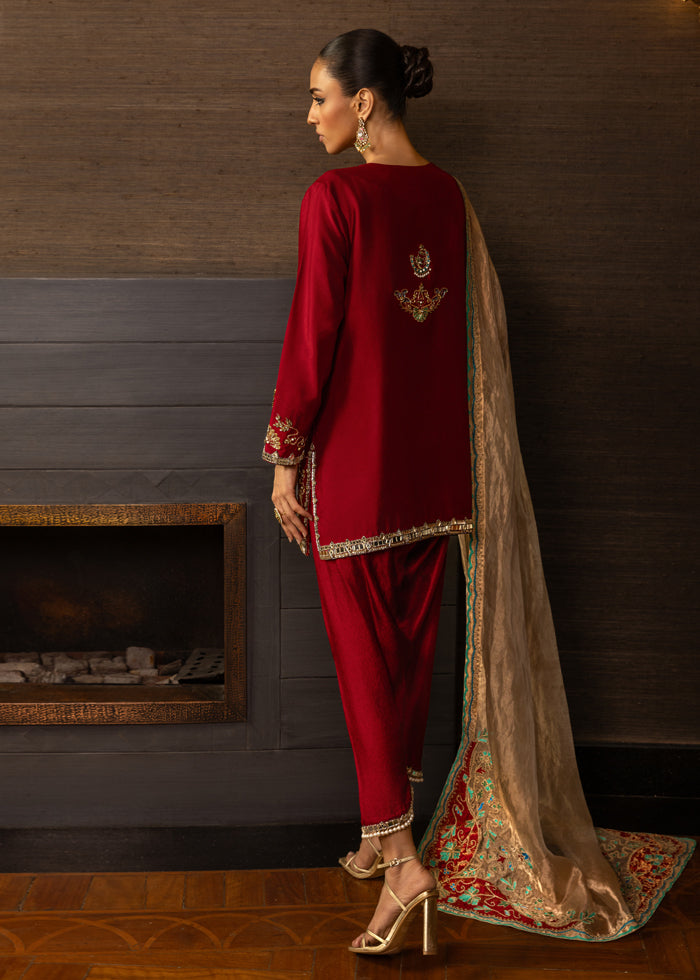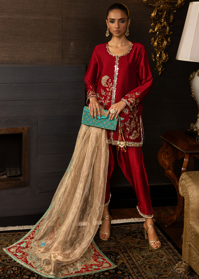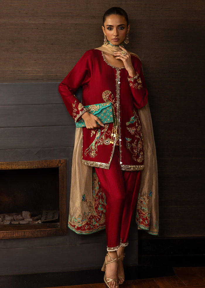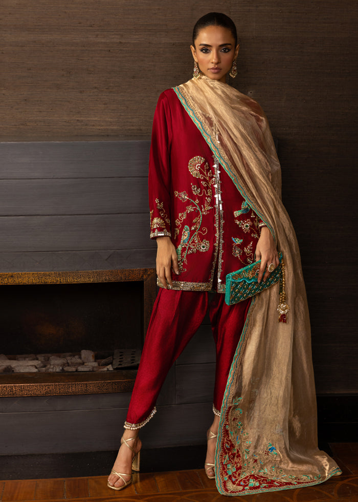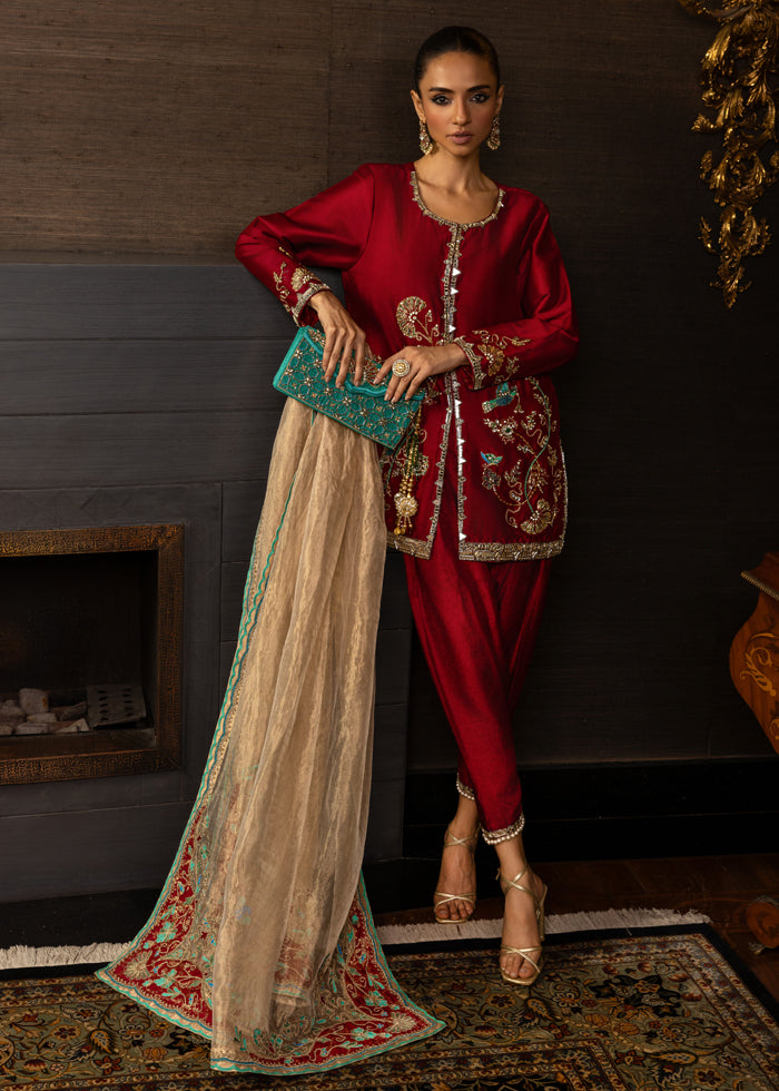 A vision of regal elegance, this scarlet red ensemble is crafted entirely in pure raw silk, creating a canvas of timeless luxury. The shirt glows with intricate handwork of zardozi, resham, and luminous polki, each motif delicately worked with an artistry that speaks of heirloom grandeur. The shalwar, equally indulgent in pure raw silk, is adorned with adda embroidery of the finest quality, enriched with jewel accents and finished with cascading pearl hangings—an opulent detail that sets it apart.
