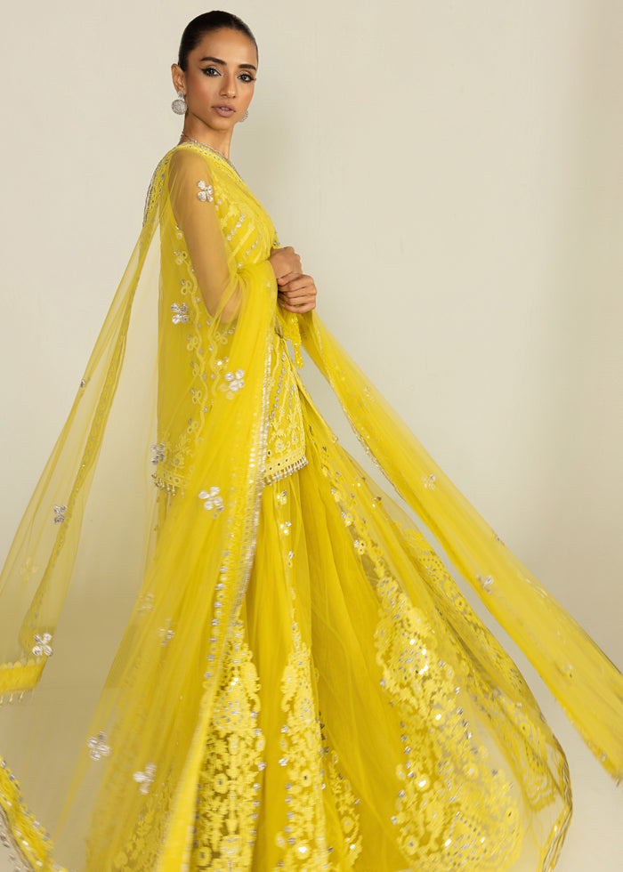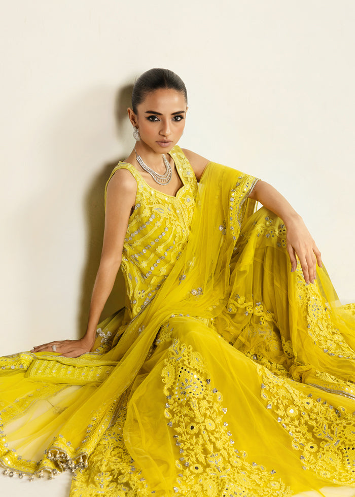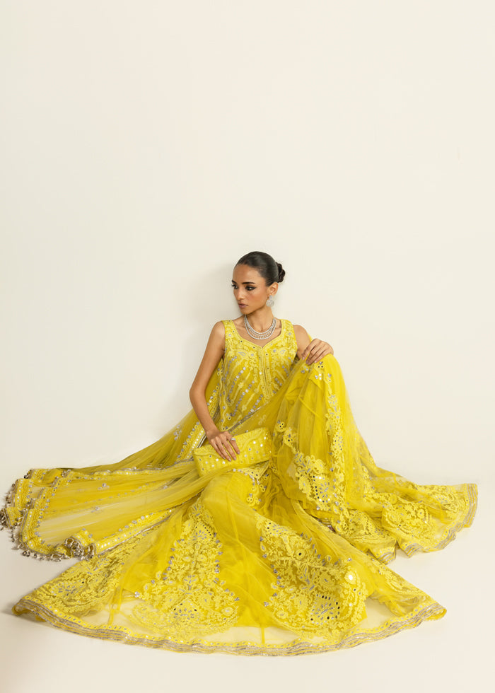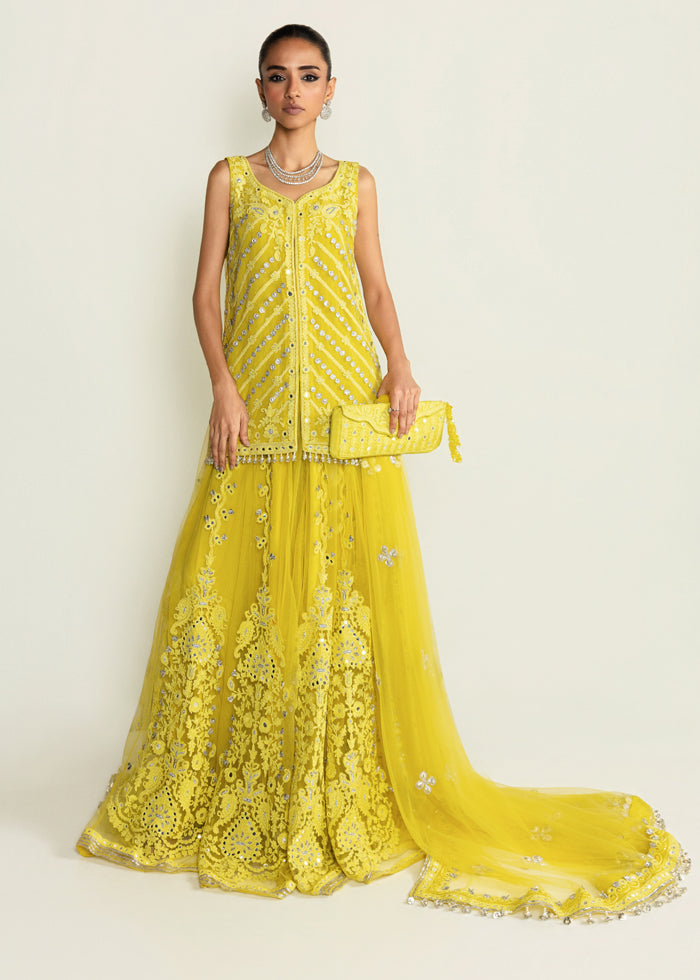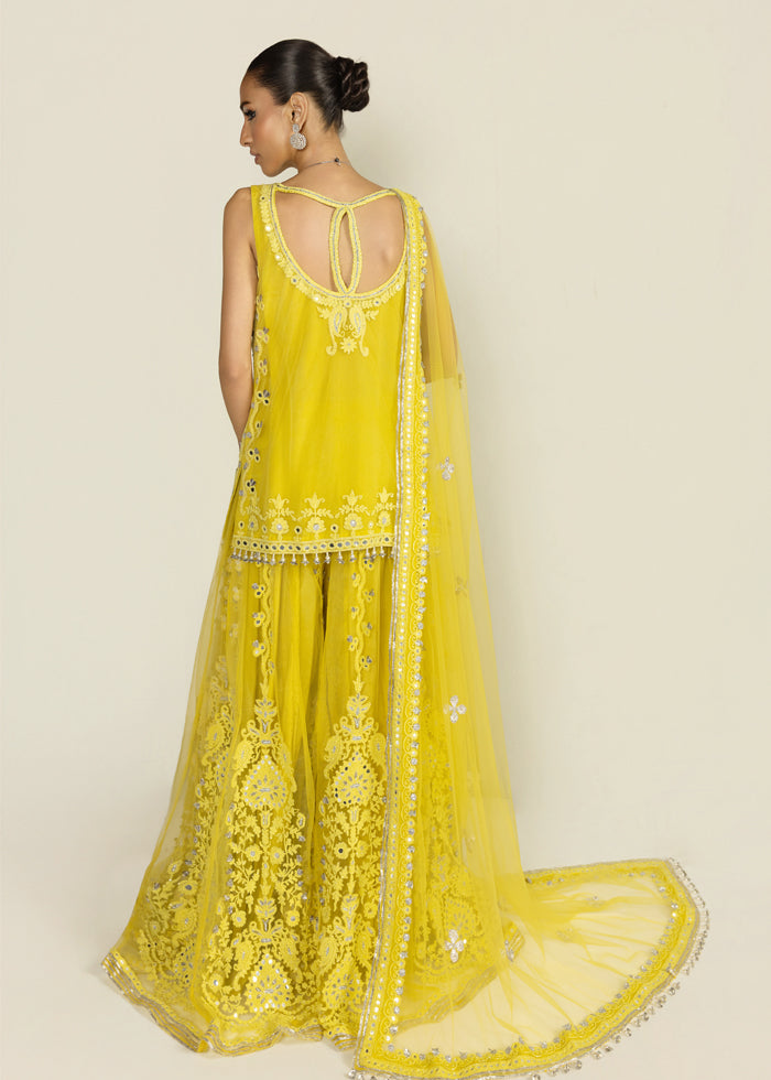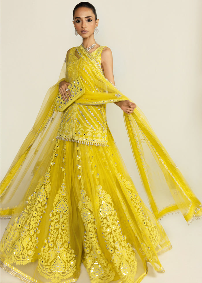 Radiating festive grandeur, this lime yellow ensemble features a net front-open jacket shirt paired with a flowing net sharara and a sheer, trailing dupatta. The design shimmers with exquisite mirror work, intricate marori, and delicate gota, brought together with timeless artistry.