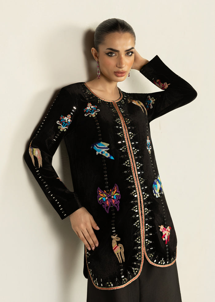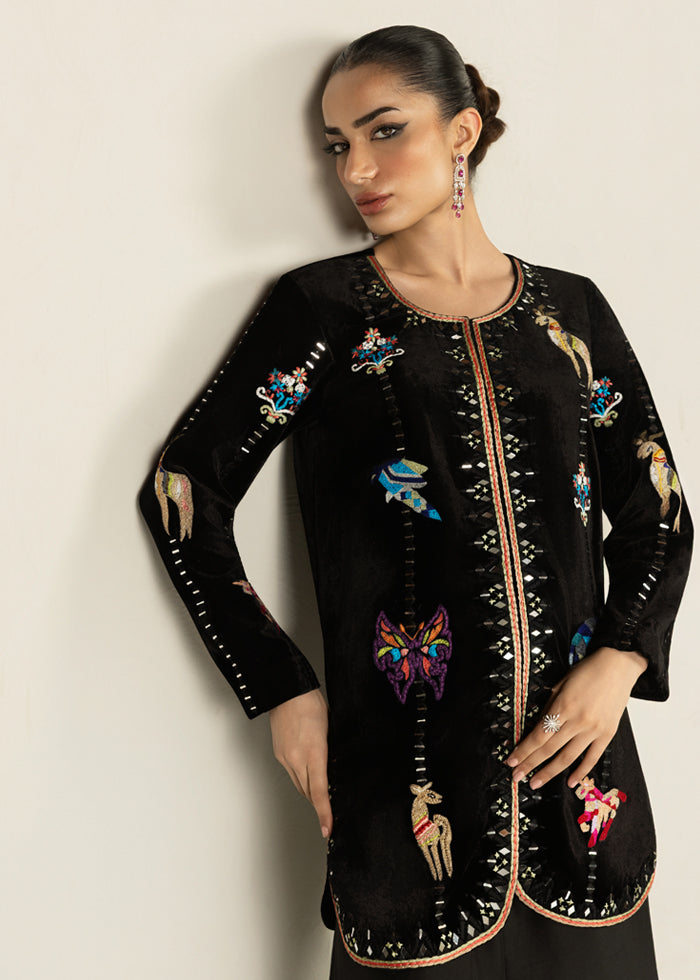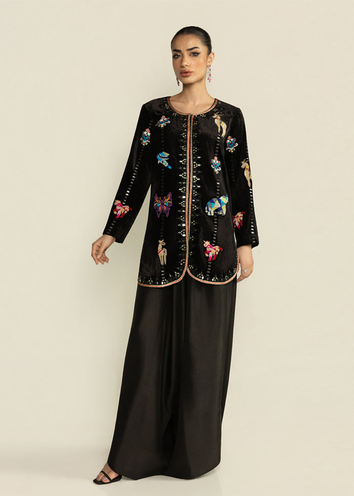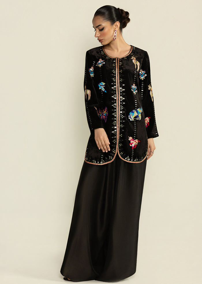 Our signature Noreen Neelam aesthetic is evident in this captivating ensemble — a striking black French velvet jacket where whimsy meets artistry.