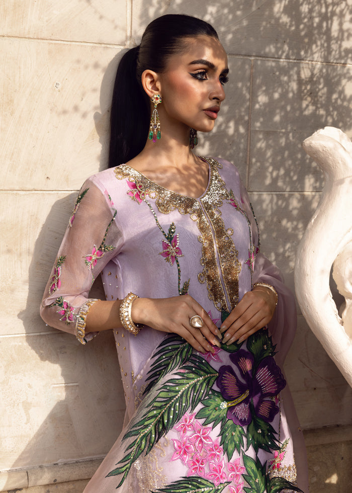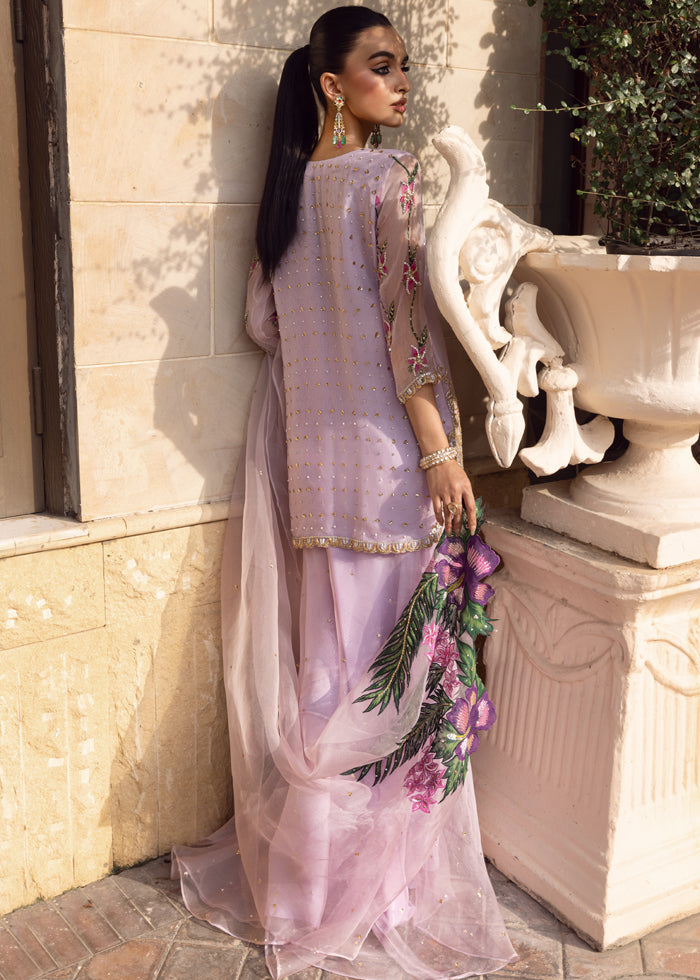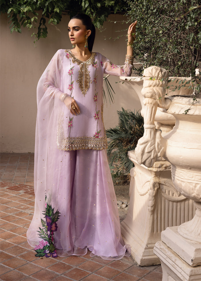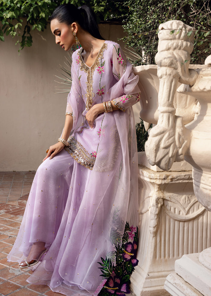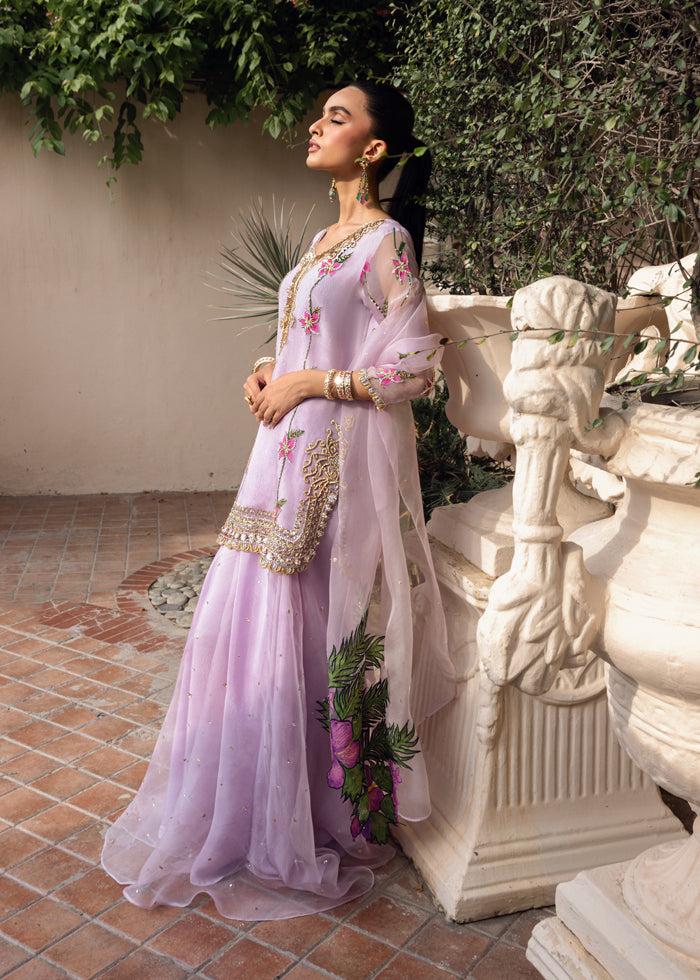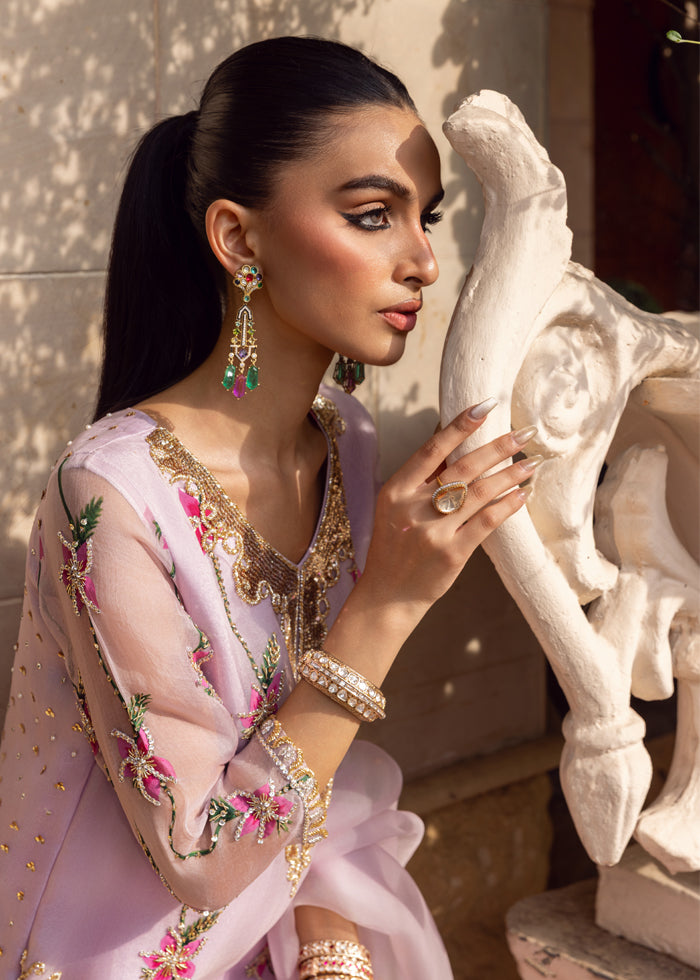 An ethereal ensemble in a dreamy lavender hue, this design captures timeless elegance with its harmonious blend of handwork and artistry. The pure organza shirt is adorned with intricate zardozi, kutdana, Sitara and much more, delicately accented with hand-painted floral motifs—each stroke crafted with unmatched finesse.