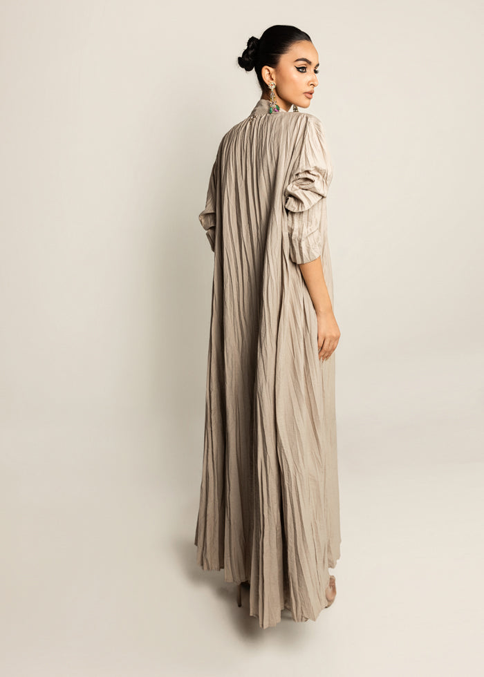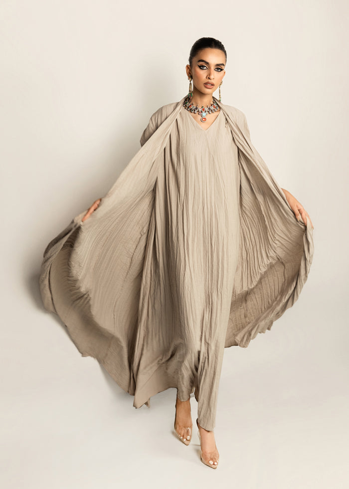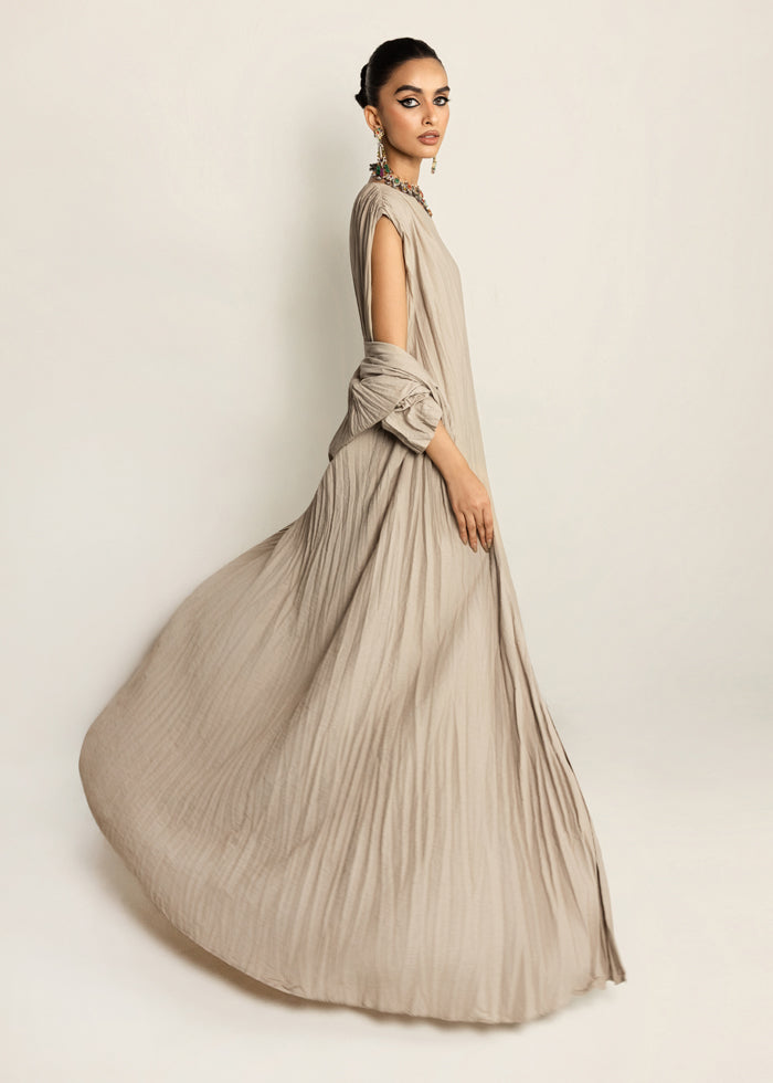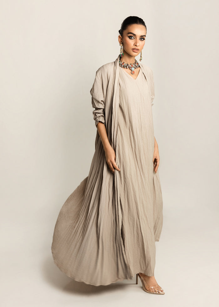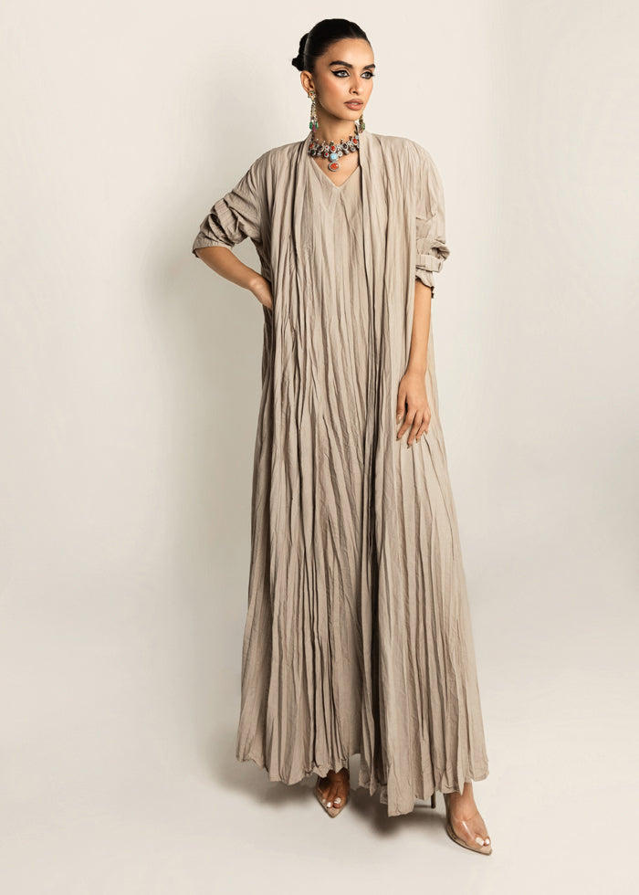 A vision of modern grace, this Sandy grey ensemble flows with effortless charm. The long, fluid jacket pairs seamlessly with the sleeveless dress, their crushed form creating movement, depth, and timeless allure. Versatile yet striking, it transitions effortlessly from day to night with a touch of refined elegance.