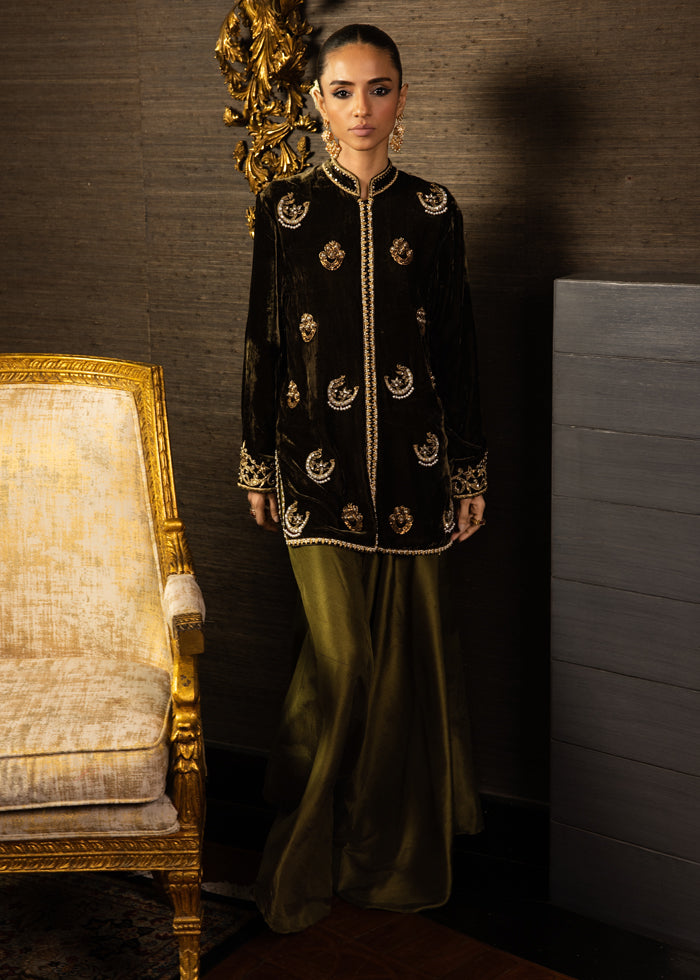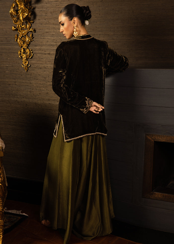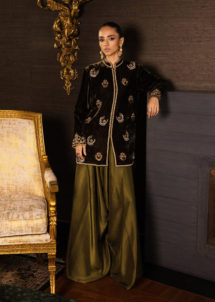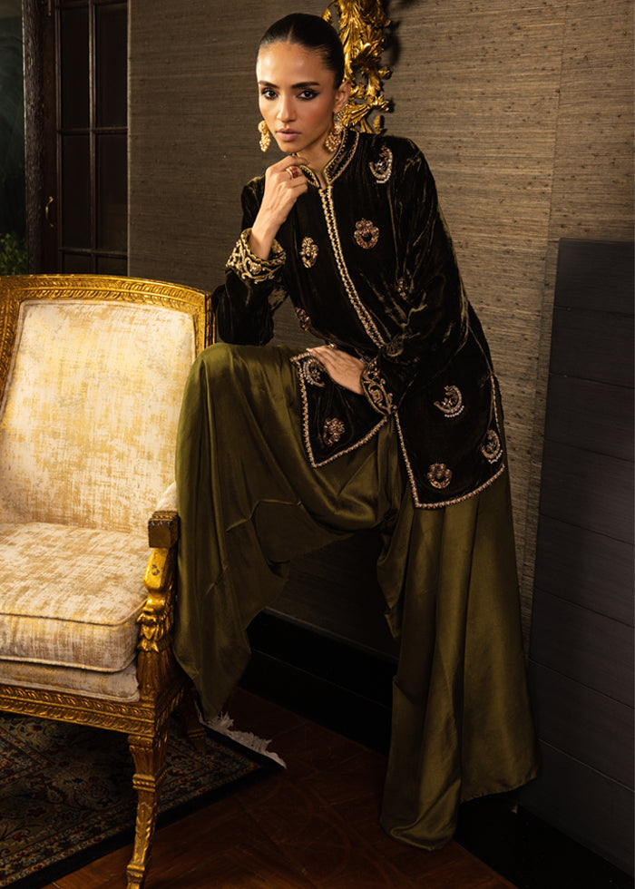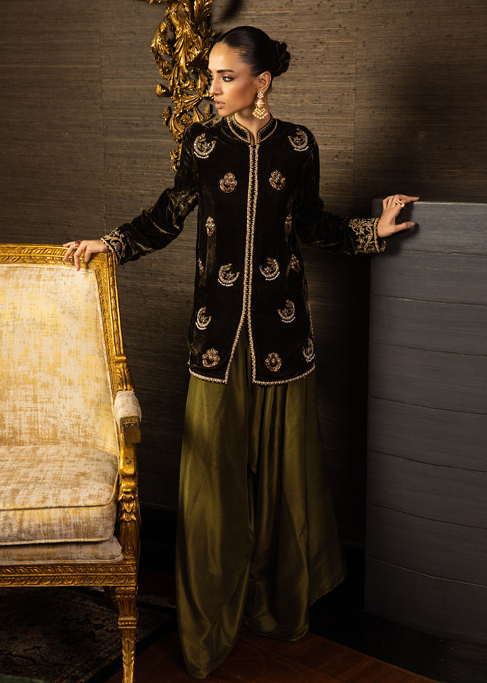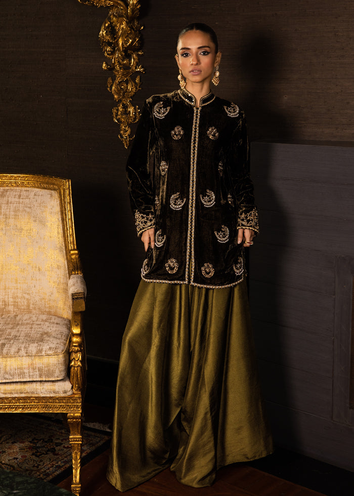 A luxurious olive bronze French velvet jacket, adorned with the finest handwork of zardozi, Polki, and pearls, each motif whispering tales of timeless craftsmanship. The rich velvet folds conceal quiet opulence, while a silk-printed lining within reveals an intimate touch of artistry. Paired with a pure raw silk swirl shalwar, this ensemble moves with effortless grace — a harmonious balance of structure and softness, where heritage grandeur meets contemporary allure.