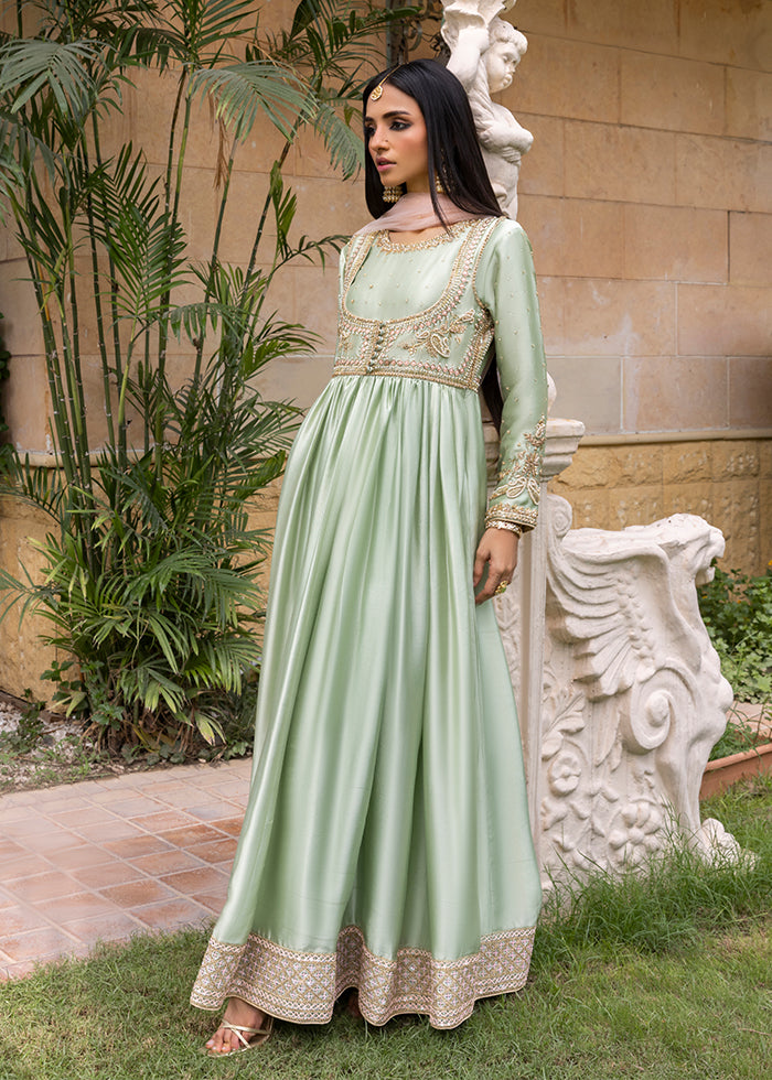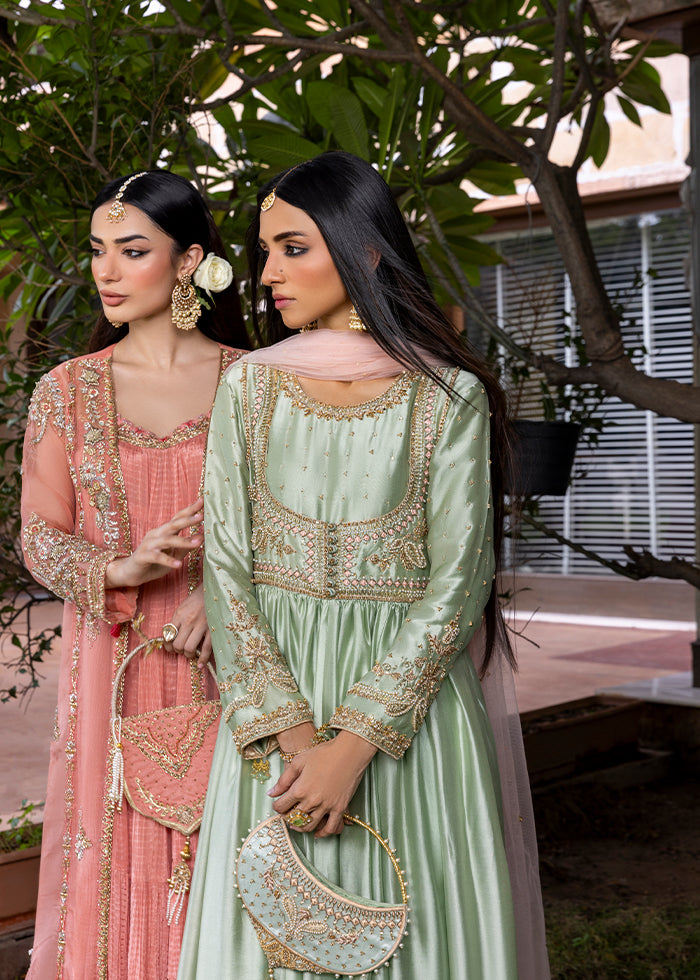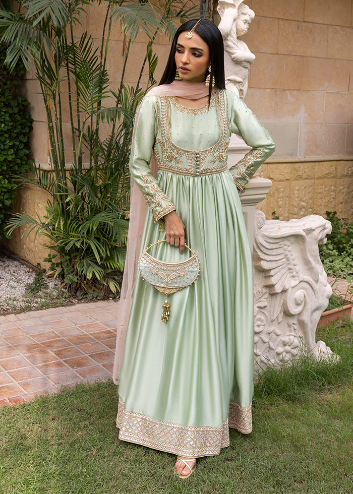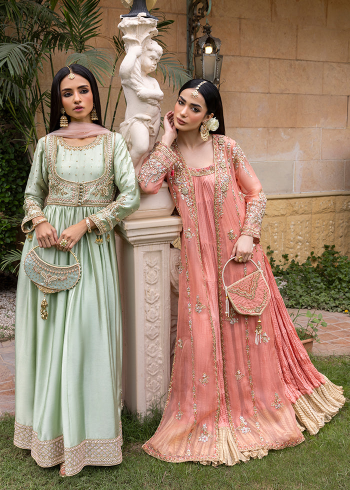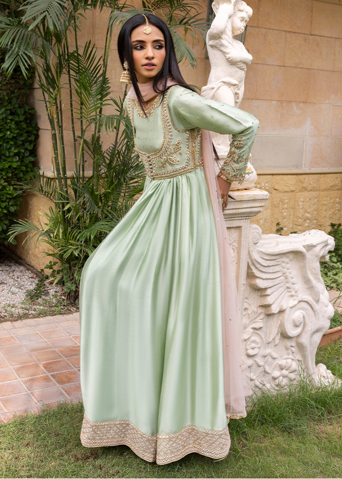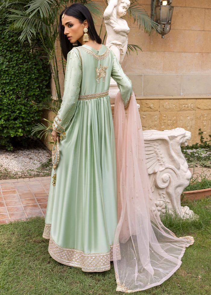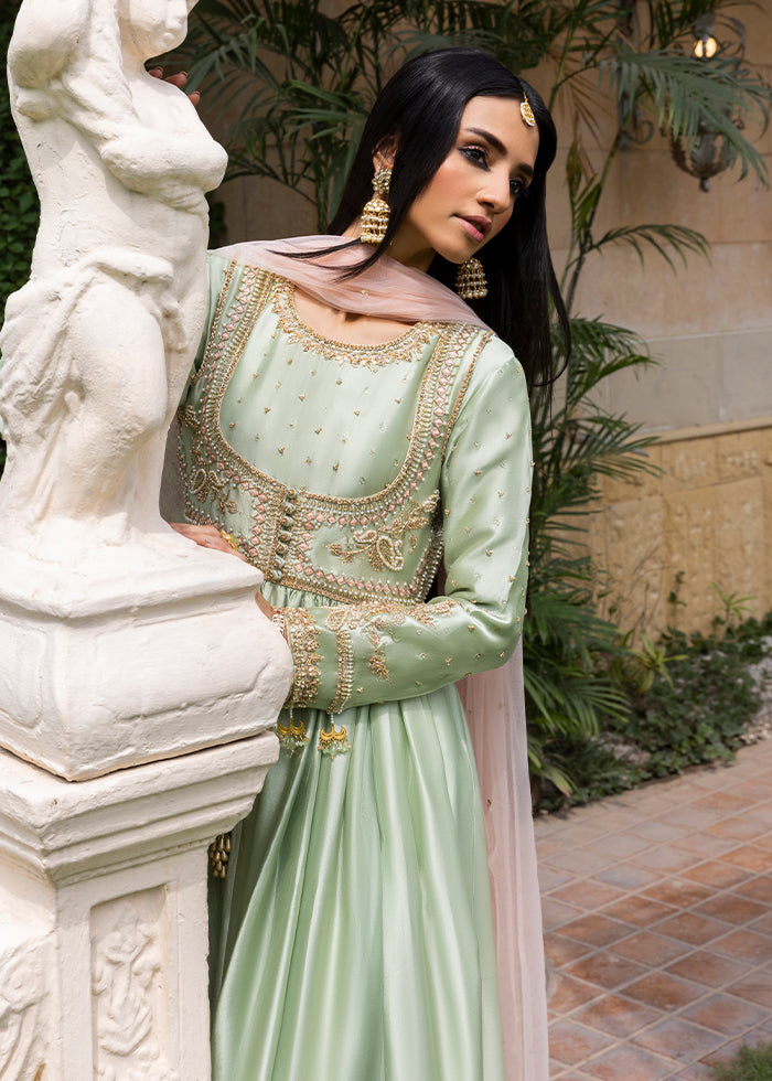 Grace meets tradition in this stunning mint green Kalidar, crafted from pure silk and adorned with intricate handwork. Beautifully crafted with delicate zardozi, tila, dabka, and resham hand work.